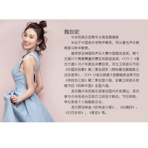 魏伽妮,中央民族乐团青年女高音。 2013年毕业于中国音乐学院声歌系,师从中国音乐学院曲学选副教授、马秋华教授。曾主演过大型民族管弦乐苗族歌舞剧《仰欧桑》;大型民族音乐诗剧《牛郎织女》。曾获2011亚洲国际声乐大赛金奖;2014央视“寻找刘三姐”六强;2015河北卫视《中华好民歌》总冠军;2017《